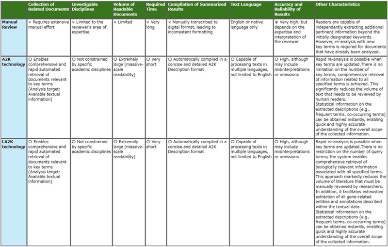 The table below shows a comparison between manual reviews and A2K/LA2K technologies.